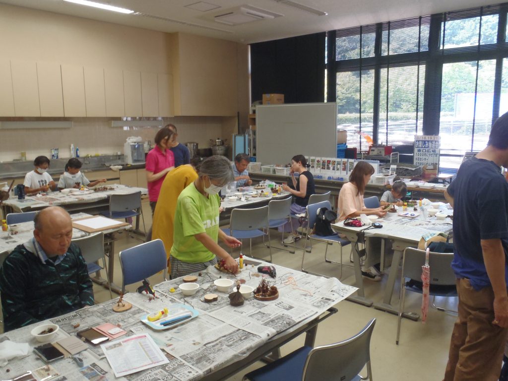 平成29(2017)年から夏と冬に2回行っている、いろんな木の実や小枝で作る「森の工作」を、みかも山公園緑の相談所講習室で行いました。定員(25名)いっぱいの参加申し込みがありましたが、酷暑の影響もあってか直前にキャンセルが相次ぎ、13名(子ども4名、大人9名)の参加となりました。気温がぐんぐんと上がる中、冷房の効いた講習室では快適な活動となりました。