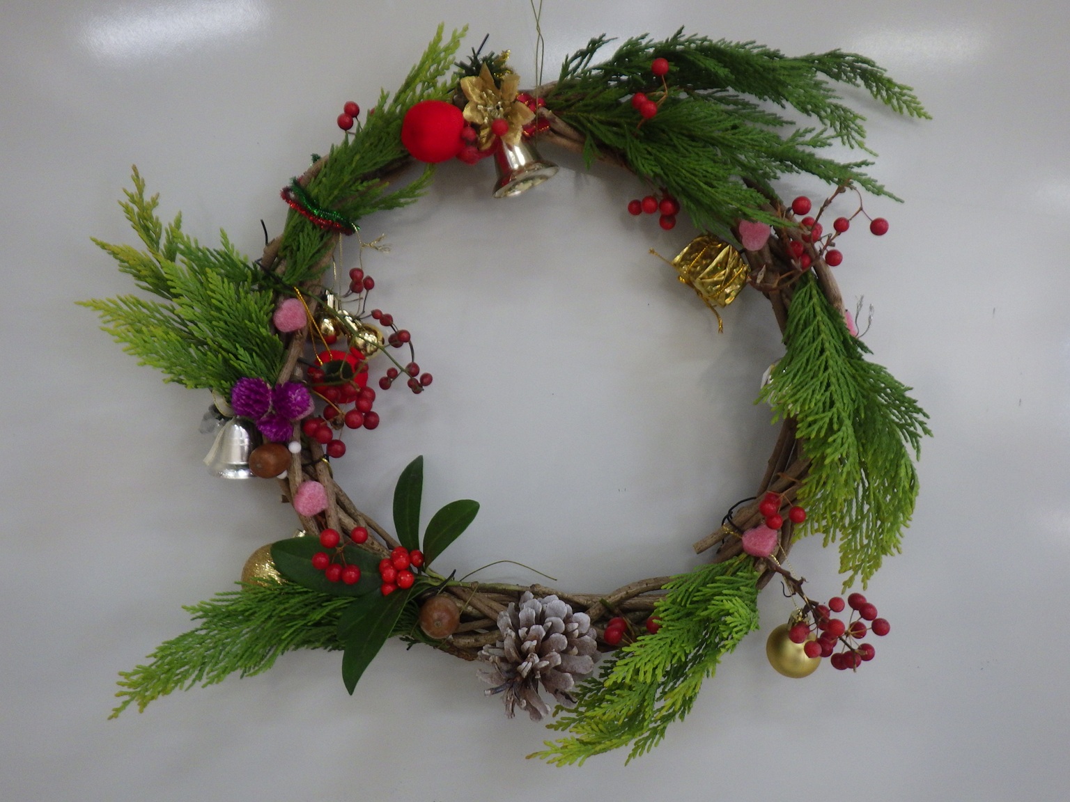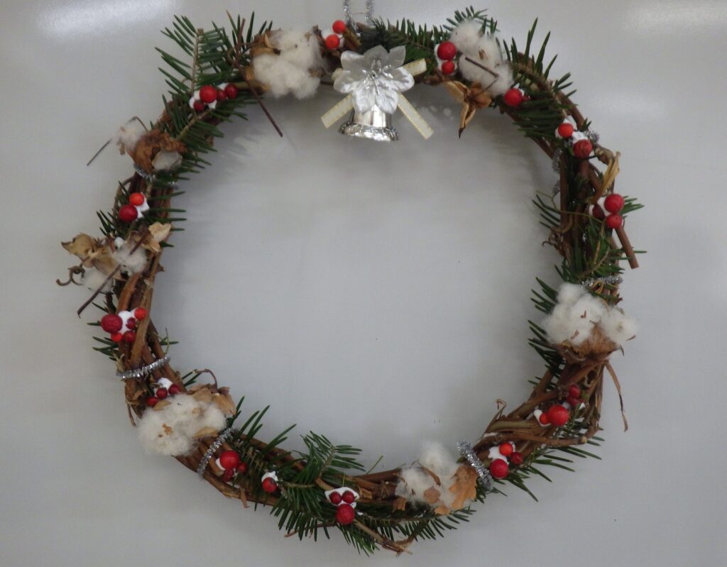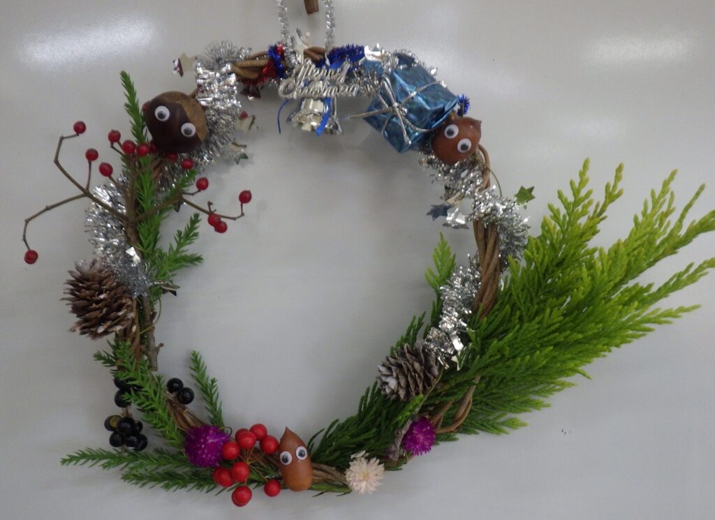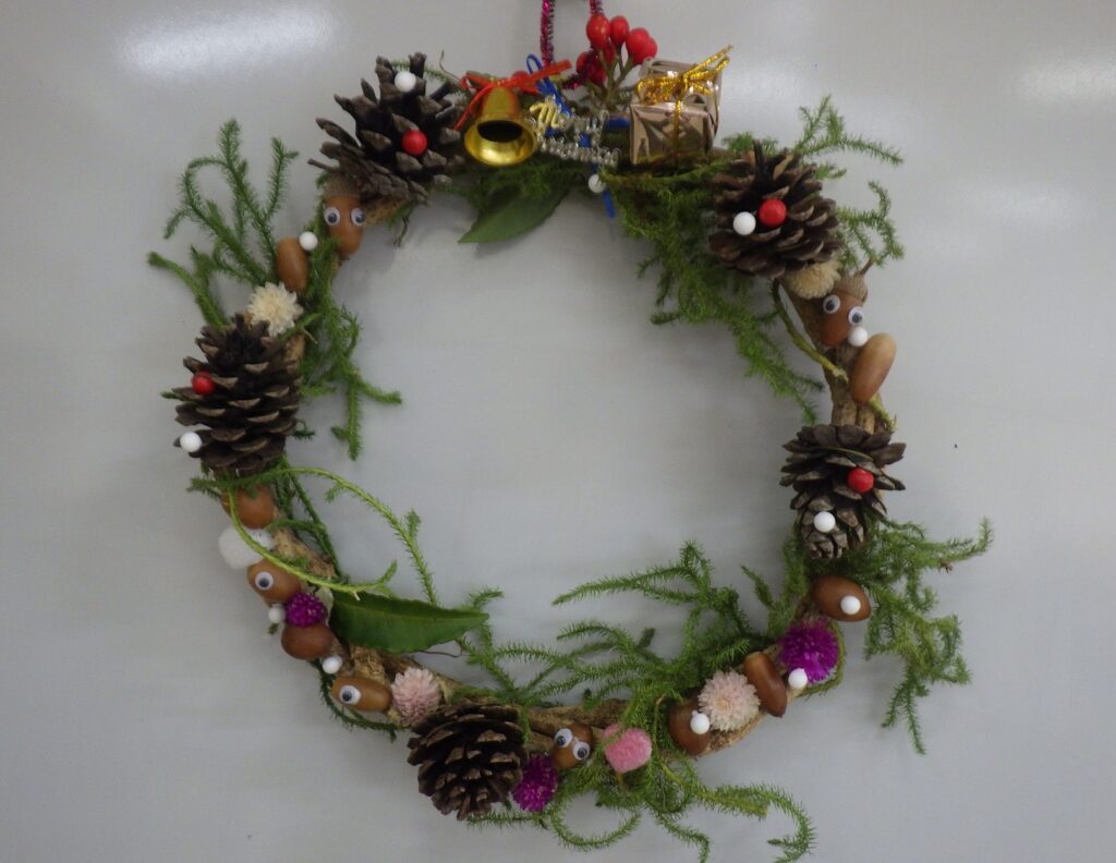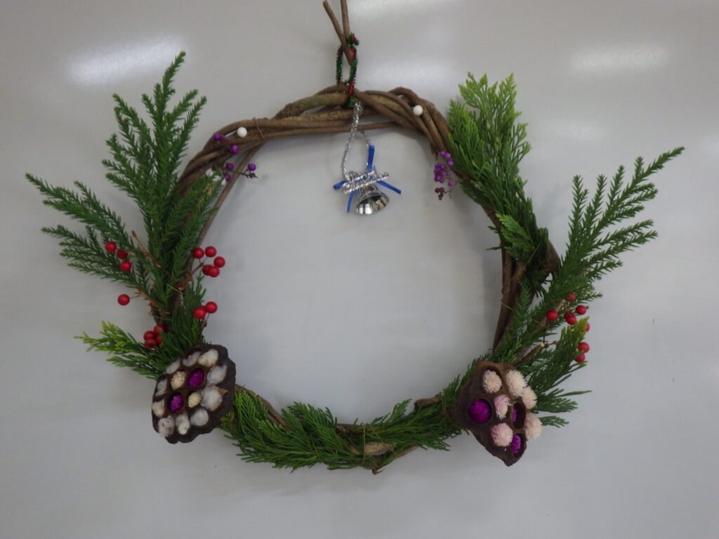 本件は、足利市の生涯学習部門つながりで、筑波公民館様から口コミ的な広がりで、今年初めてのリース作りのご依頼をいただいたものです。筑波、名草両公民館様でリース作りと木の実の工作の講師依頼をこのところ毎年いただいており、当会の年末恒例県南行事に今年から新たに1件加わりました。活動の場が広がり嬉しい限りです。