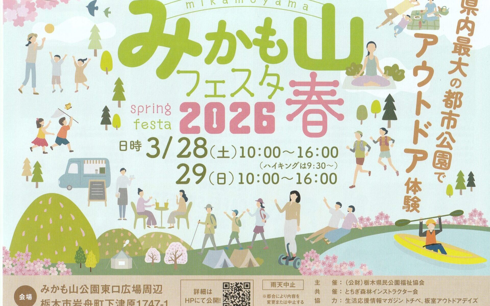 「みかも山フェスタ2026春」は3月28日(土)、29日(日)の2日間、「県内最大の都市公園でアウトドア体験」と銘打って開催され、当会は「共催」という形で参加しました。当会は29日(日)のみ「森のクイズラリー」での参加です。春フェスタは今回で3回目、参加者は36名(子ども18名、大人18名)という結果で、昨年の116名(子ども50名、大人66名)、一昨年の166名(子ども75名、大人91名)と確実に減ってきており、案内看板や内容の充実化が課題となりました。