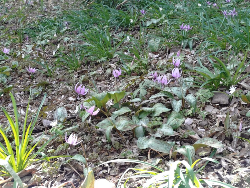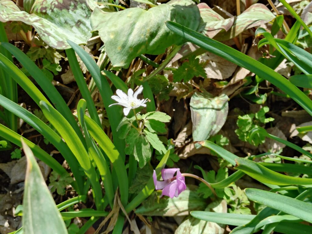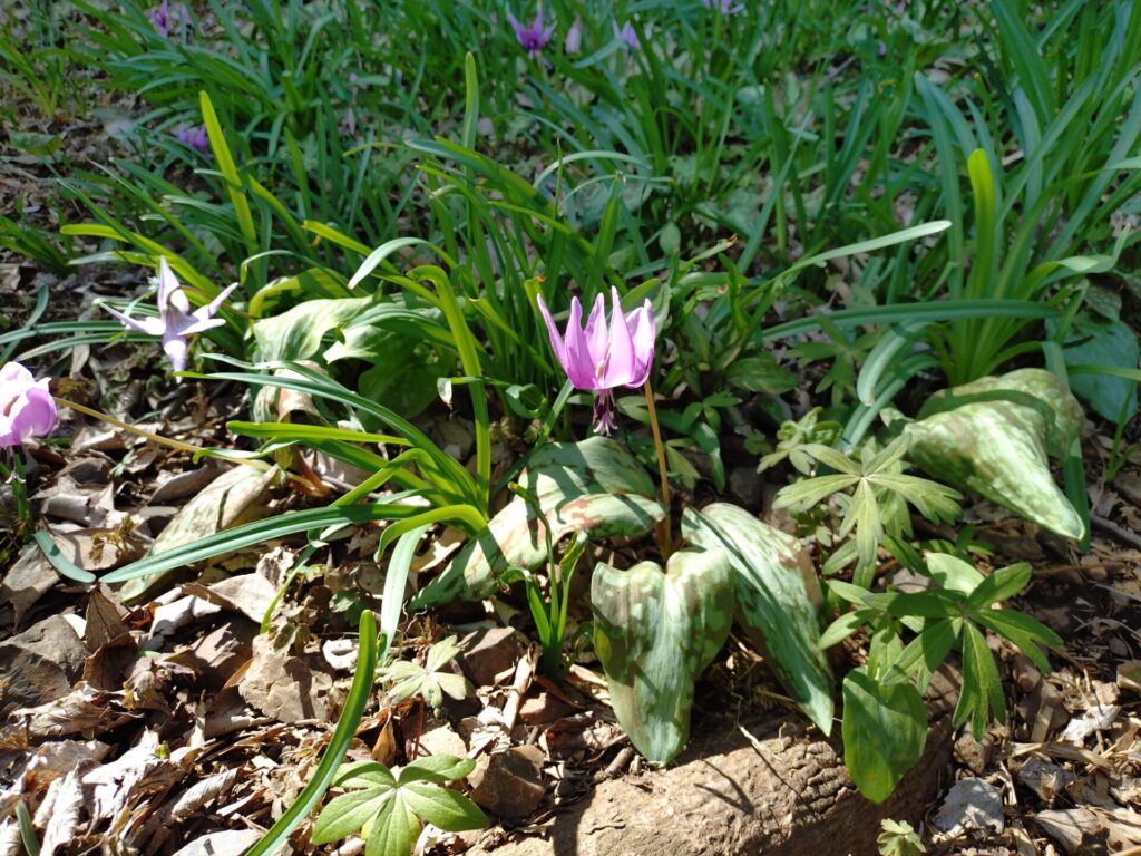 ⑨シュンラン(春蘭)の花が咲いています。どんな色をしている?【目立たないけど、花が咲いているのを気付いてほしくて出題したもの。】