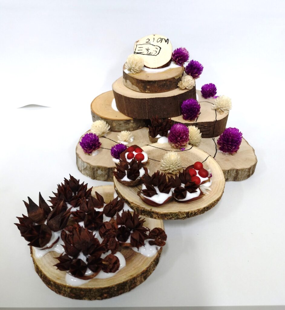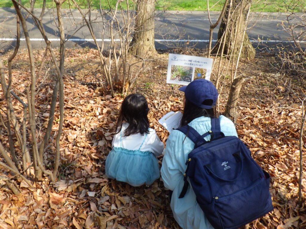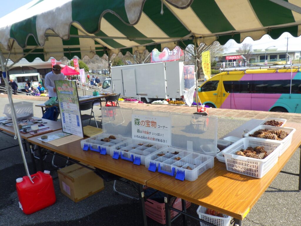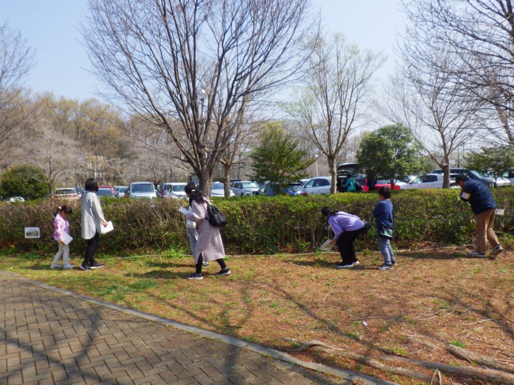 出題する問題は、良く観察してほしいとの思いから、咲いている花の花びらの枚数や色などを出題したいところですが、当日に咲いているものの予測が難しいところです。今回、下見に行く時間が取れず、昨年と同様の出題が多かったと反省しています。昨年からの工夫は、虫メガネを置いたり、「森の宝物」コーナー(森の工作で使用する多種多様な木の実)を用意したりしましたが、手を抜いた分だけ見返り(参加者数)が少ない結果となり、大いに反省しています。テント1張りと「県内最大の都市公園」を自由に使える好条件の中、どんな「アウトドア体験」を提供できるのか、「みかも山フェスタ2027春」に向けてみんなで考えていきたいと考えています。(野口)