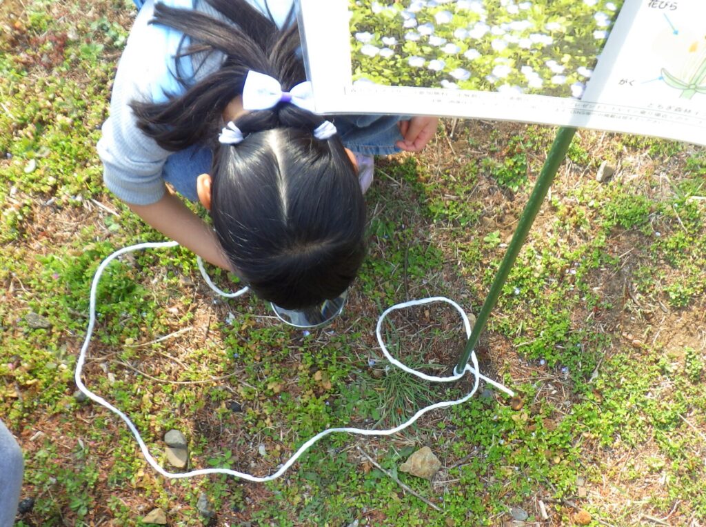 ⑫オオイヌノフグリが咲いているよ!花びらは何枚?(大きいのと、小さいのがあるよ。)【答えは大きな花びら3枚、小さな花びら1枚、大きな虫メガネも置いておきました。午後3時頃には、ほとんどの花が落ちてしまい、花をつけているのを探して何とか継続。】