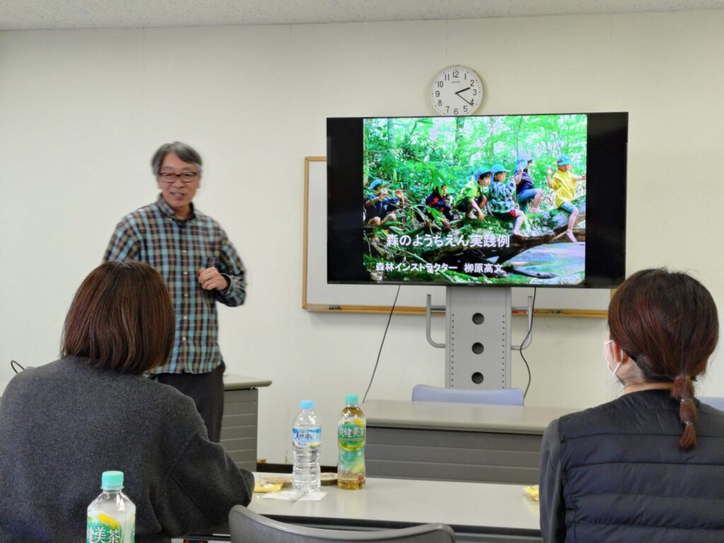 また今回は、会員として新加入いただける、元高野山大学特任准教の柳原高文さんに「森のようちえん」についてのお話をいただきました。森のようちえんは、近年注目されている教育プログラムで、先生が立ち上げた教室も定員を上回る人気だったそうです。子どもたちに対する接し方、特に自発的な行動をうながす方法などについて、大変興味深いお話を聞くことが出来ました。今後は柳原(先生)と一緒に観察会なども予定しますので、より詳しく学ぶことが出来ると思います。(吉村祐一)
