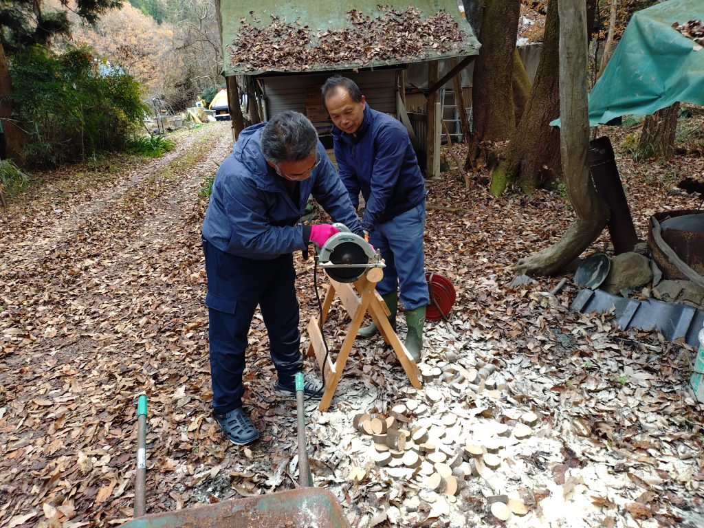 最後は工作の土台となる板の切り出しです。手ごろな太さのエゴノキの幹を伐採し、丸のこで適当な厚さ、長さに裁断します。こちらも大量にストックができました。