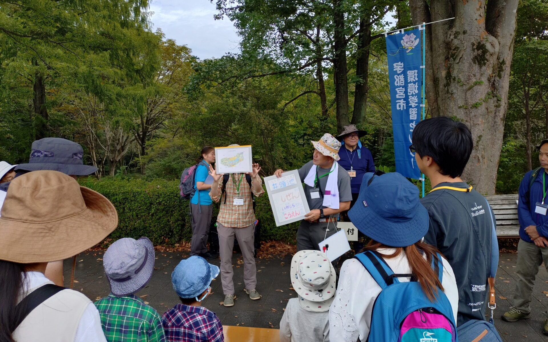 インストラクター7名は、3名が受付と採点を担当し、4名が出題ポイントでの解説を手分けして行いました(午前・午後で役割交代)。開会前に生活応援情報マガジン「トチペ」のインスタグラムの撮影があり、それぞれの出展ブースが「みかも山(やま)フェスタ」の1文字を担当し、開会を宣言。当会は「ま」の担当でしたが、4名は出題ポイントに行ってしまったので、受付担当の3名のみで撮影に応じました。